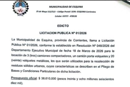 EDICTO - LICITACION PUBLICA Nº 01/2026 La Municipalidad de Esquina, provincia de Corrientes, llama a Licitación Pública Nº 01/2026, conforme…