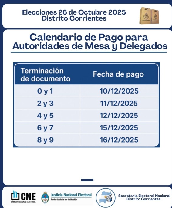 La Secretaría Electoral Nacional – Distrito Corrientes informó el cronograma oficial de pagos para las autoridades de mesa y delegados que participaron en las Elecciones del 26 de octubre de 2025.