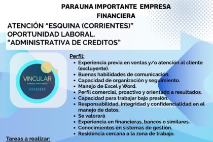 Importante empresa financiera busca Administrativa de Créditos en Esquina