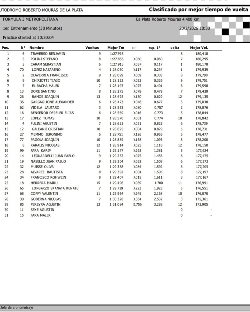 Con calor intenso presente, se desarrollaron los entrenamientos oficiales para la segunda fecha del calendario 2026 de la Fórmula 3 Metropolitana, que este fin de semana se presenta en el autódromo “Roberto Mouras” de La Plata.
