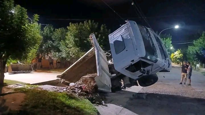 Un camión perteneciente al municipio quedó atrapado tras hundirse el asfalto en la intersección de las calles Uruguay y José María Soto.