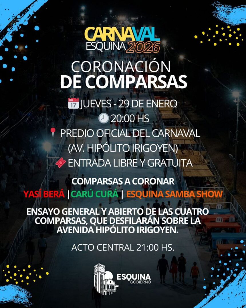 La ciudad de Esquina vivirá esta noche una de sus celebraciones más esperadas del calendario cultural con la coronación de comparsas del Carnaval Esquina 2026, que tendrá lugar en el predio oficial ubicado sobre la avenida Hipólito Yrigoyen.