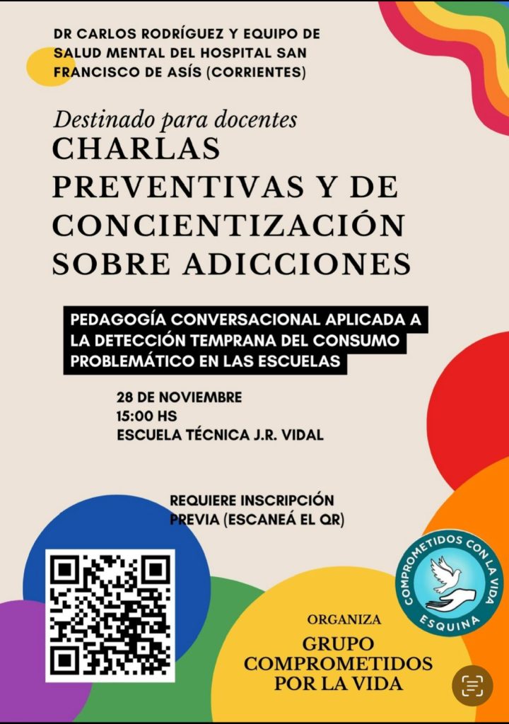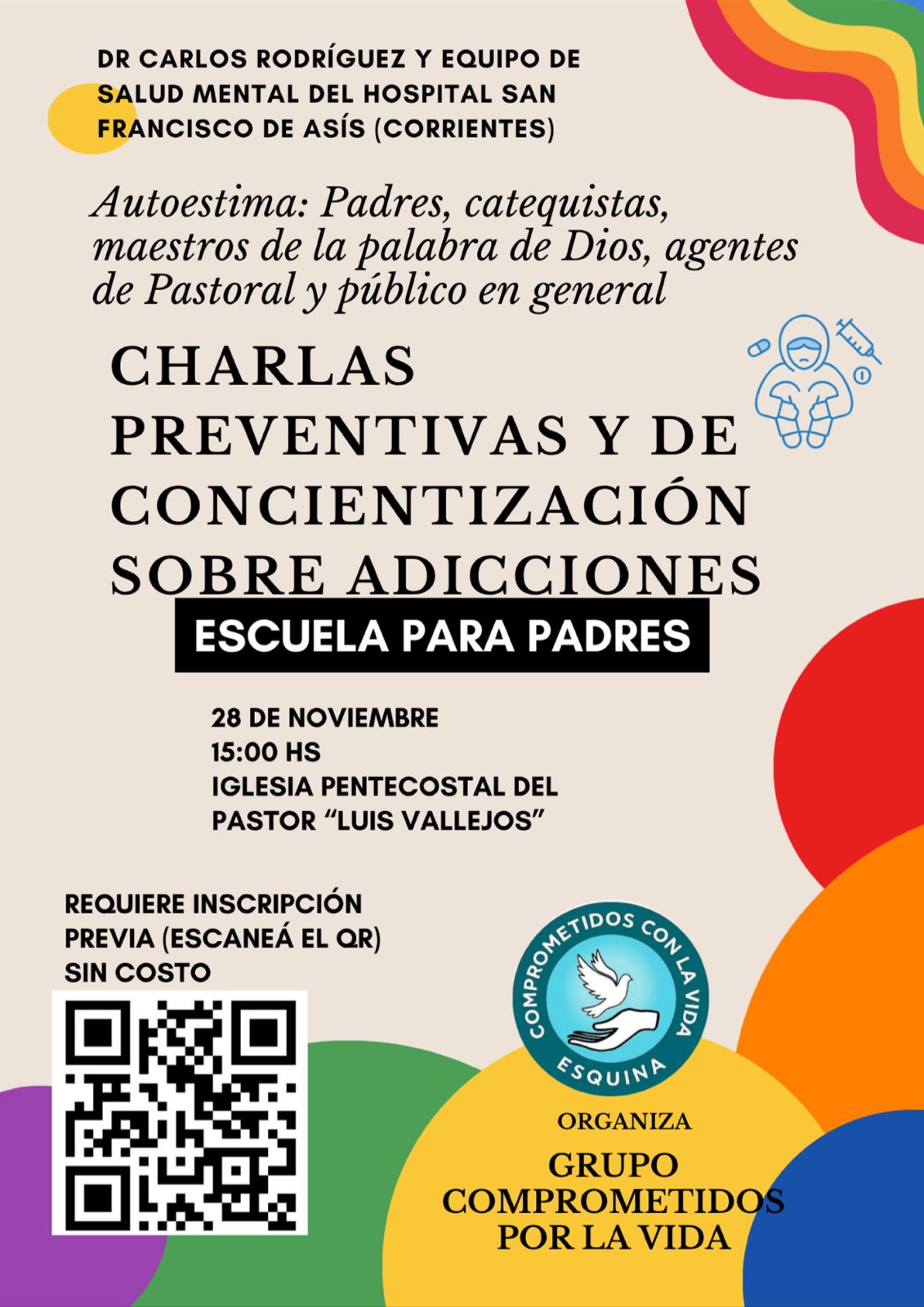 Serán encuentros de una hora u hora y media con diferentes profesionales, organizados por el grupo Comprometidos por la Vida, integrado por representantes de la Iglesia Católica, la congregación del pastor Vallejos y otros actores de la comunidad. “Es un esfuerzo que hacemos por el bien de la sociedad, ante el flagelo visible de las adicciones”, señaló.