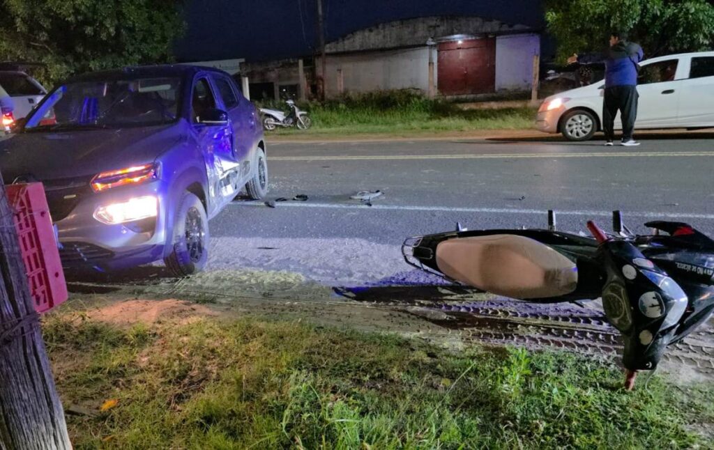 El siniestro ocurrió a la altura comprendida entre las calles Los Ceibos y Los Lirios, cuando un automóvil Renault Kwid que se encontraba sobre la banquina habría intentado realizar una maniobra de giro en “U”. En ese momento, una motocicleta de 110 cc que circulaba en la misma dirección no logró esquivarlo, impactando contra el vehículo y provocando la caída del conductor y su acompañante.