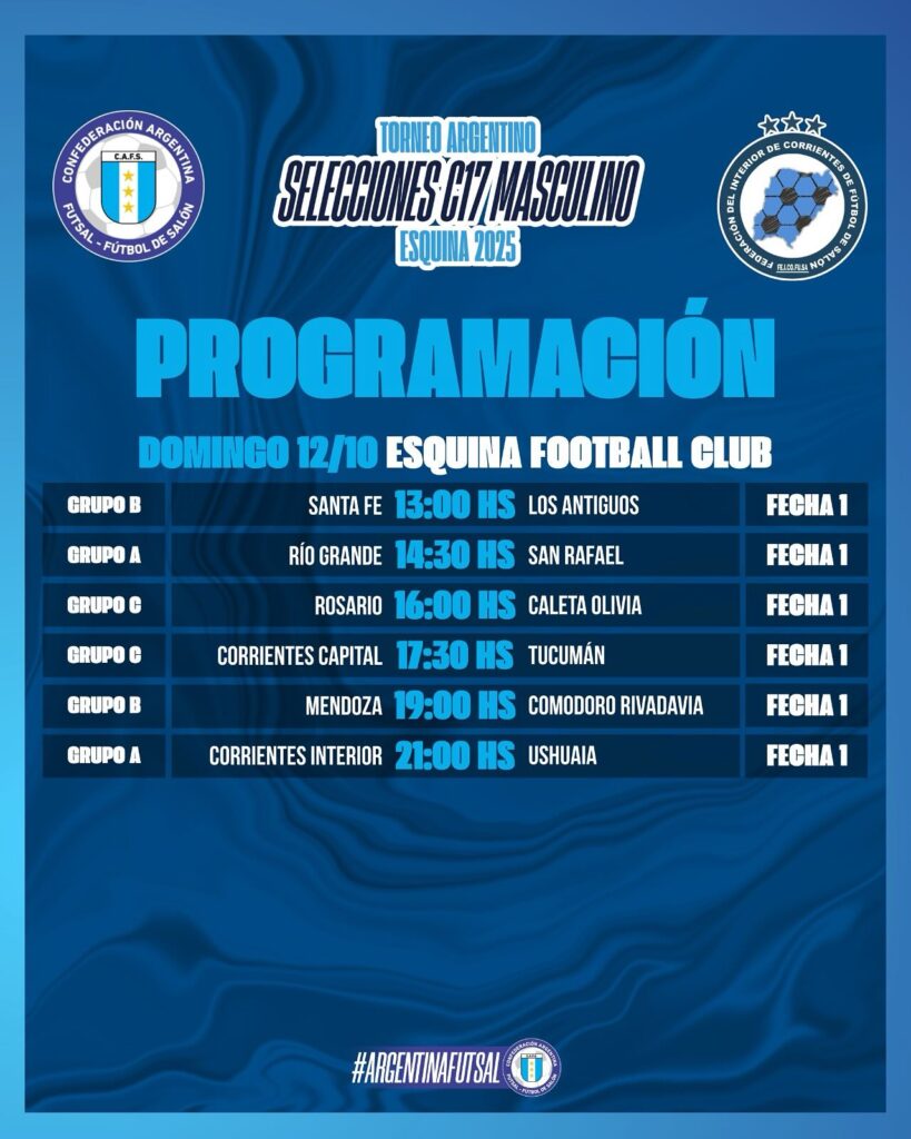 El Esquina Football Club será escenario de la primera fecha, con una intensa programación de partidos que comenzará este domingo 12 de octubre a las 13:00 horas, con el enfrentamiento entre Santa Fe y Los Antiguos, y se extenderá hasta el último turno de las 21:00, cuando jueguen Corrientes Interior y Ushuaia.