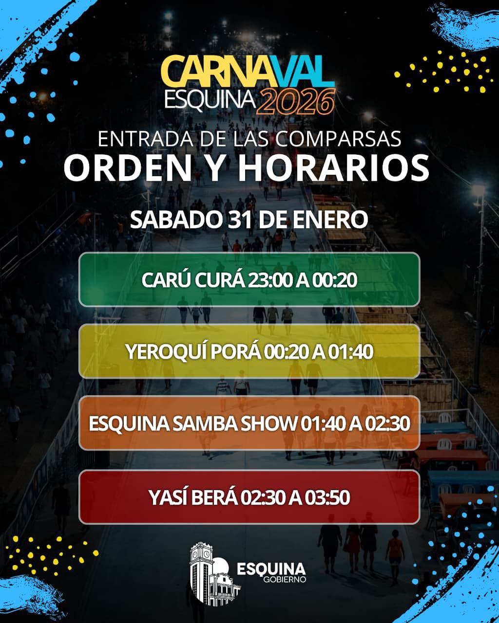 Según el orden establecido, la apertura estará a cargo de Carú Curá, que ingresará al corsódromo de 23:00 a 00:20. Luego será el turno de Yeroqui Porá, que se presentará de 00:20 a 01:40.