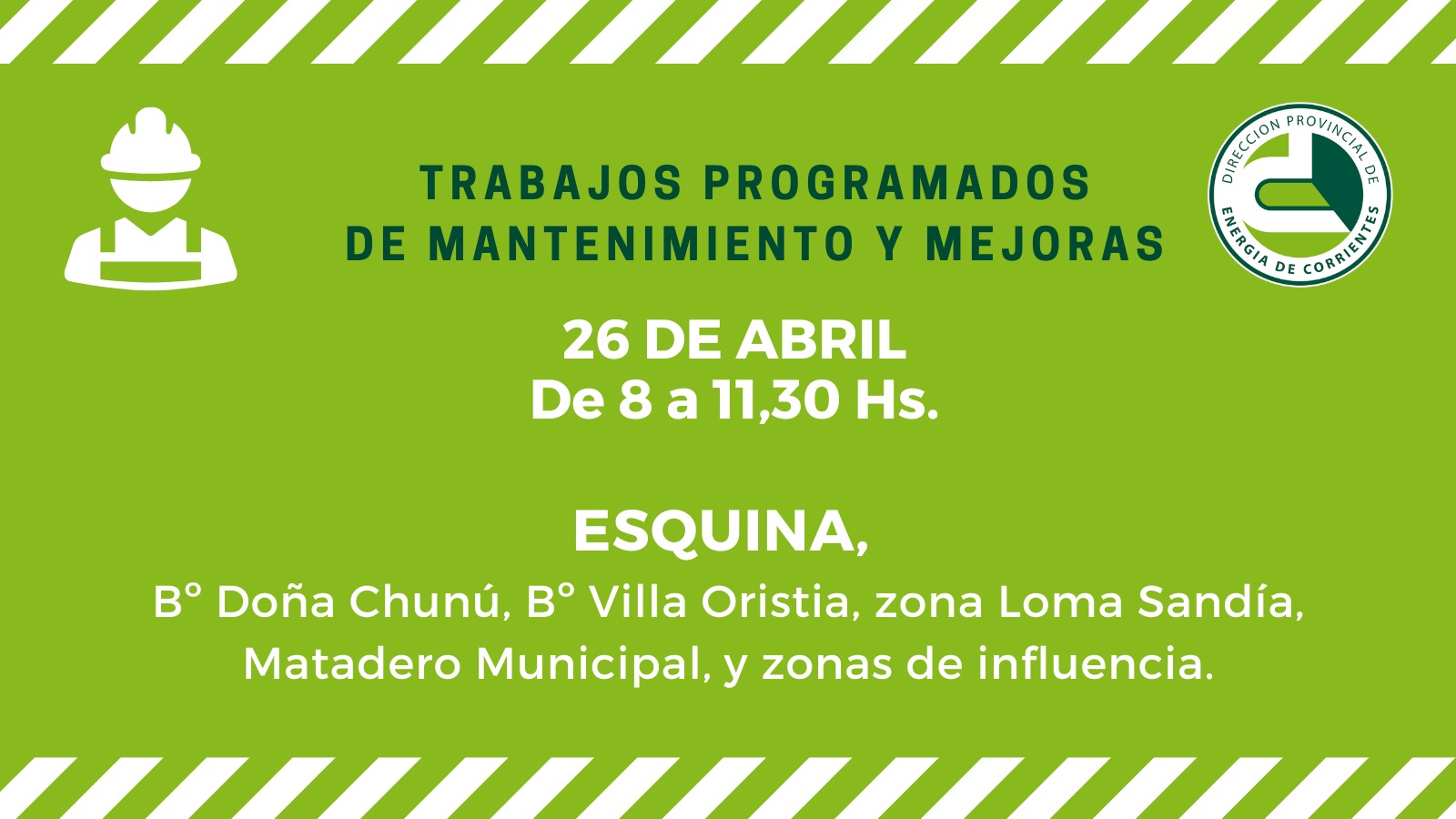 La Dirección Provincial de Energía de Corrientes (DPEC) informa que con motivo de realizar mejoras en el servicio, se ejecutarán tareas de mantenimiento de Líneas de Media Tensión, por lo cual se interrumpirá el suministro de energía eléctrica en la localidad de ESQUINA, de acuerdo al siguiente cronograma: