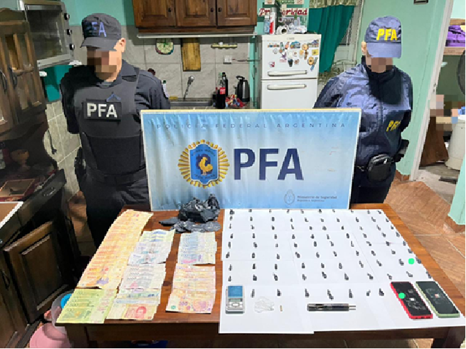 Como resultado del allanamiento, se secuestraron dosis de cocaína listas para su comercialización, balanzas de precisión, un arma de fuego, dinero en efectivo, elementos utilizados para el fraccionamiento de la droga y un motovehículo empleado para realizar las entregas.