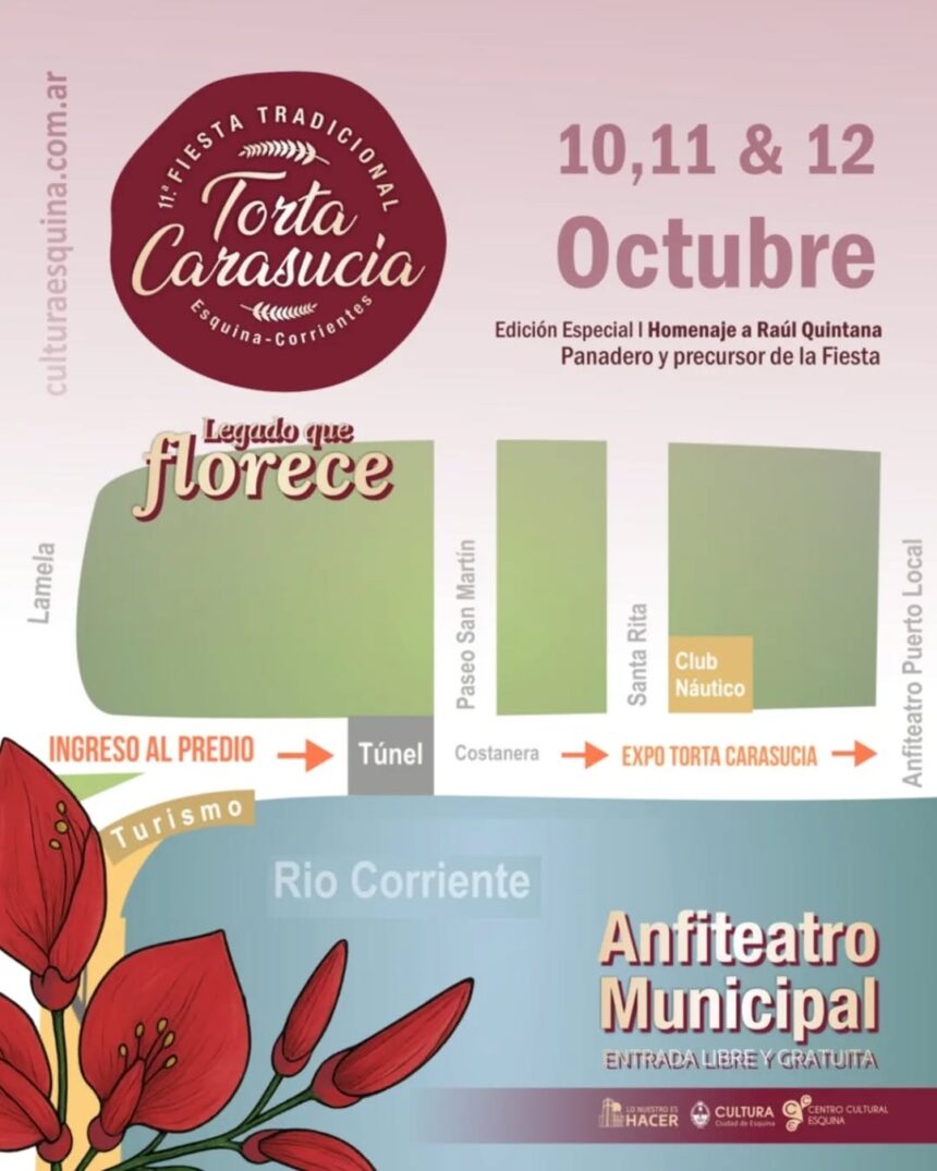 Esquina se prepara para vivir una nueva edición de la Fiesta Tradicional de la Torta Carasucia, que se realizará los días 10, 11 y 12 de octubre en el Anfiteatro Municipal, con entrada libre y gratuita.