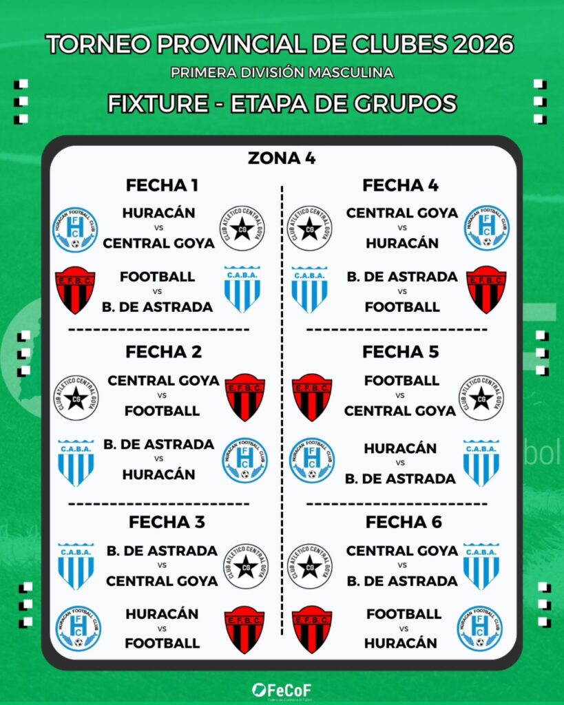 La Liga Esquinense de Fútbol contará con dos representantes y, en el arranque, habrá duelo entre equipos de la ciudad. Por la Zona 4, el domingo a las 19 horas, Esquina Foot Ball Club será local ante Berón de Astrada.
