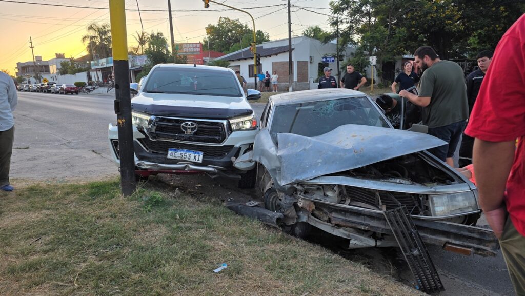 En horas de la tarde, alrededor de las 19:30, se registró un fuerte accidente de tránsito en la intersección de avenida Juan Ramón Vidal y avenida Hipólito Yrigoyen, que involucró a una camioneta Toyota Hilux blanca y un automóvil Mitsubishi.