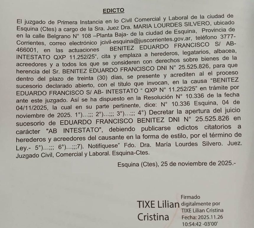 El juzgado de Primera Instancia en lo Civil Comercial y Laboral de la ciudad de Esquina (Ctes) a cargo de la Sra. Juez Dra. MARIA LOURDES SILVERO, ubicado en la calle Belgrano N° 108 -Planta Baja- de la ciudad de Esquina, Provincia de Corrientes, correo electrónico jcivil-esquina@juscorrientes.gov.ar, teléfono 3777- 466001, en las actuaciones BENITEZ EDUARDO FRANCISCO SI AB- INTESTATO QXP 11.252/25″, cita y emplaza a herederos, legatarios, albacea, acreedores y a todos los que se consideren con derechos sobre bienes de la herencia del Sr. BENITEZ EDUARDO FRANCISCO DNI N° 25.525.826, para que dentro del plazo de treinta (30) días, se presente y acrediten al el proceso sucesorio declarado abierto, con el título que invocan, en la causa «BENITEZ EDUARDO FRANCISCO S/ AB- INTESTATO » QXP N° 11.252/25″ en trámite por ante este juzgado. Así se ha dispuesto en la Resolución N° 10.336 de la fecha 04/11/2025, la cual en su parte pertinente, dice: N° 10.336 Esquina, 04 de noviembre de 2025.