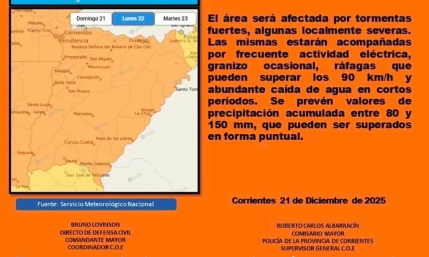 El Comité Operativo de Emergencias (COE) dependiente del Gobierno de Corrientes, emitió un Alerta Naranja “por tormenta” para la mañana de este lunes. Según el informe, afectará a todo el territorio provincial.