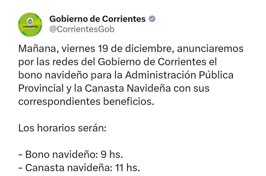 Este viernes 19 de diciembre, el Gobierno de Corrientes a través de sus redes sociales oficiales a las 9 dará a conocer el bono navideño para la Administración Pública Provincial y a las 11, hará lo propio con los correspondientes beneficios de la Canasta Navideña.