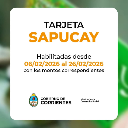 El Gobierno provincial, a través del ministerio de Desarrollo Social, informa que quedará habilitada la Tarjeta Sapucay, desde el 6 al 26 de febrero del corriente año, con los montos correspondientes.