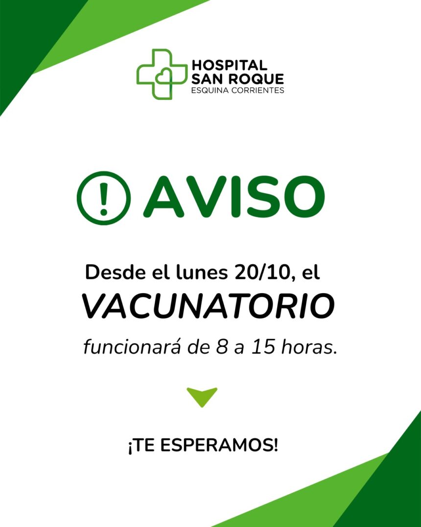 El Hospital San Roque de Esquina informa que, a partir de esta semana, el vacunatorio amplía su horario de atención: funcionará de lunes a viernes, de 8 a 15 horas, para facilitar el acceso a todas las familias.