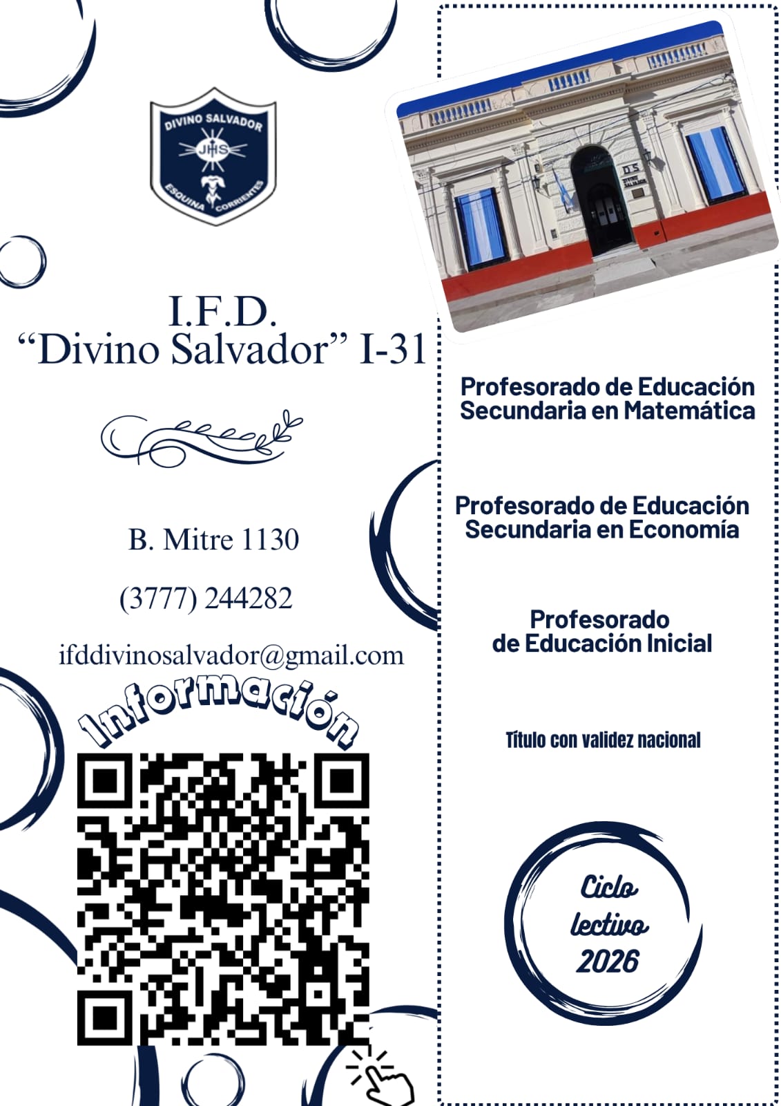 El IFD Divino Salvador informa que se encuentra abierta la inscripción para el ciclo lectivo 2026, cuya oferta académica es: