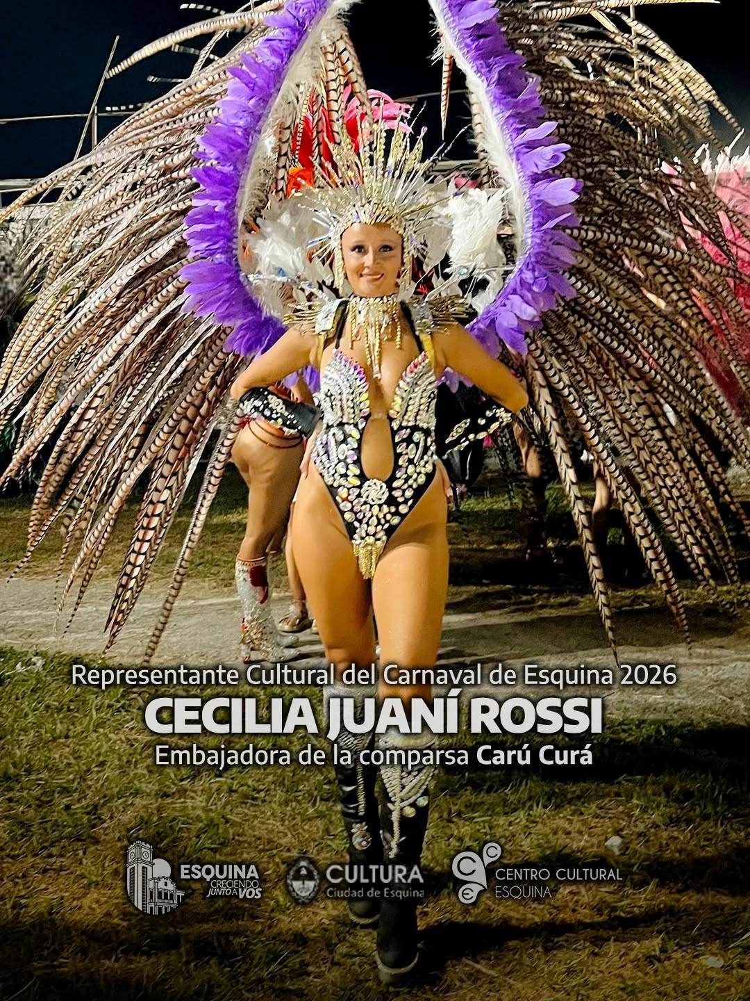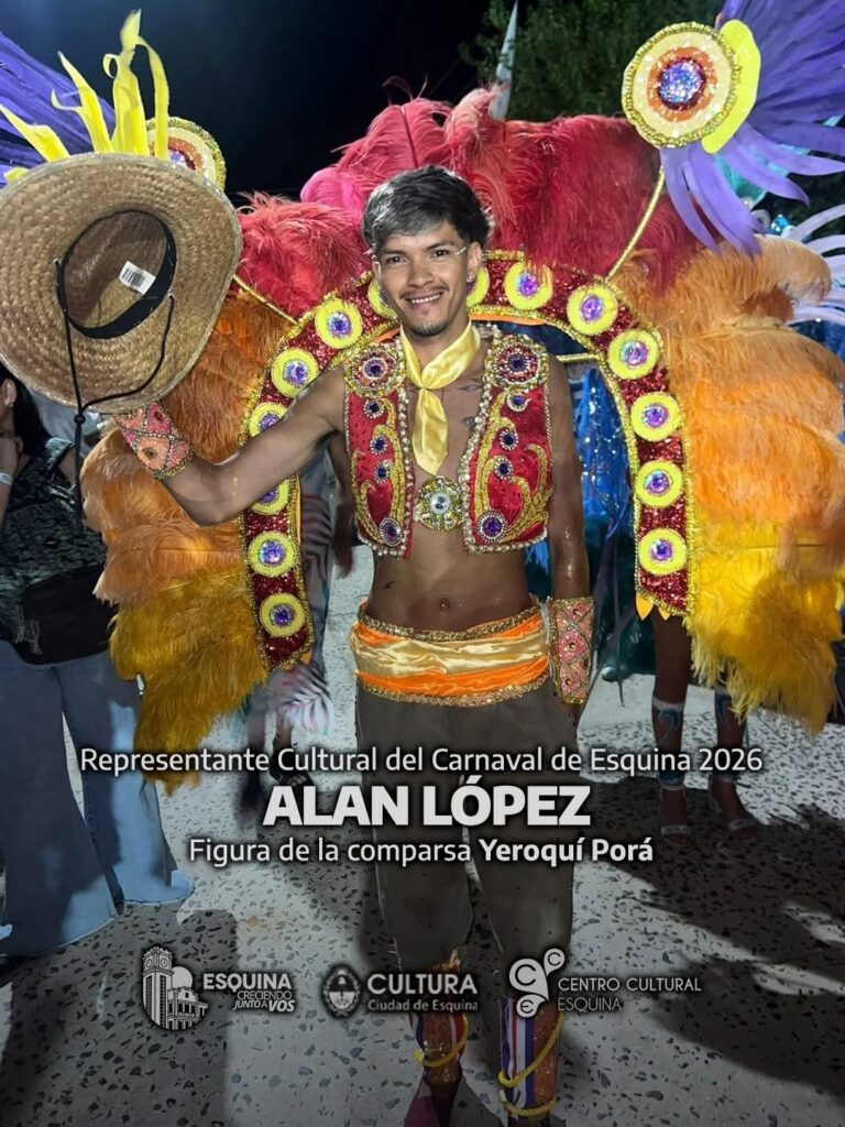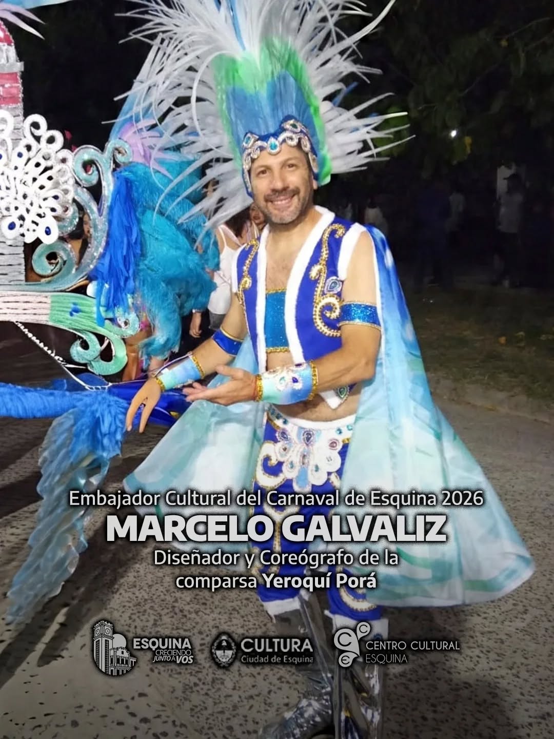 Como Embajadora Cultural del Carnaval de Esquina 2026 fue elegida Valentina Urquiza Lobo, actual embajadora de la comparsa Yasí Berá, mientras que el título de Embajador Cultural del Carnaval de Esquina 2026 recayó en Marcelo Galvaliz, diseñador y coreógrafo de la comparsa Yeroquí Porá, por su destacada trayectoria y aporte artístico.