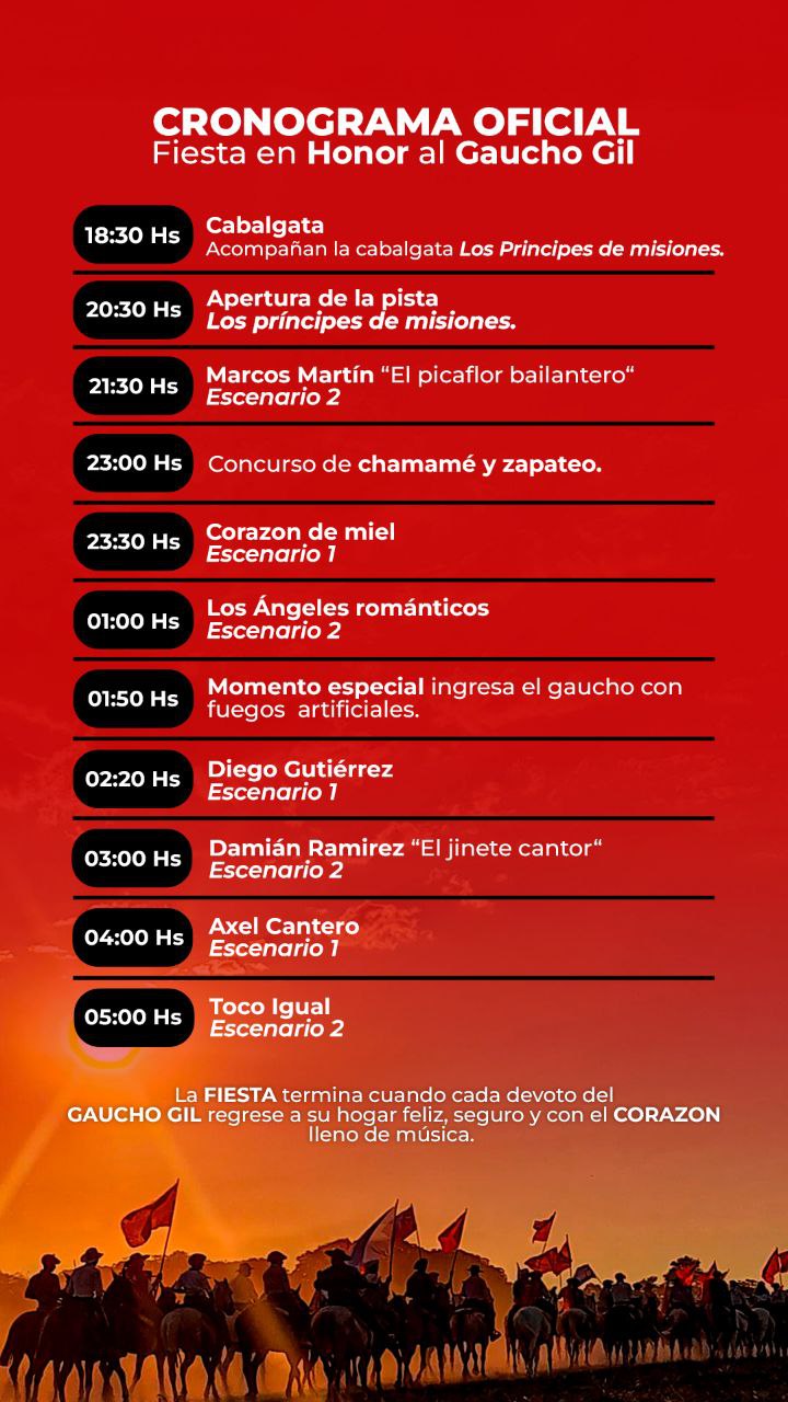 La celebración incluirá además cabalgata, fuegos artificiales y expresiones tradicionales que reflejan la profunda devoción al Gaucho Gil. Como cada año, la fiesta concluirá cuando cada peregrino regrese a su hogar “feliz, seguro y con el corazón lleno de música”, luego de vivir una noche única en El Co’ẽmba, punto de encuentro de la fe y la cultura popular correntina.