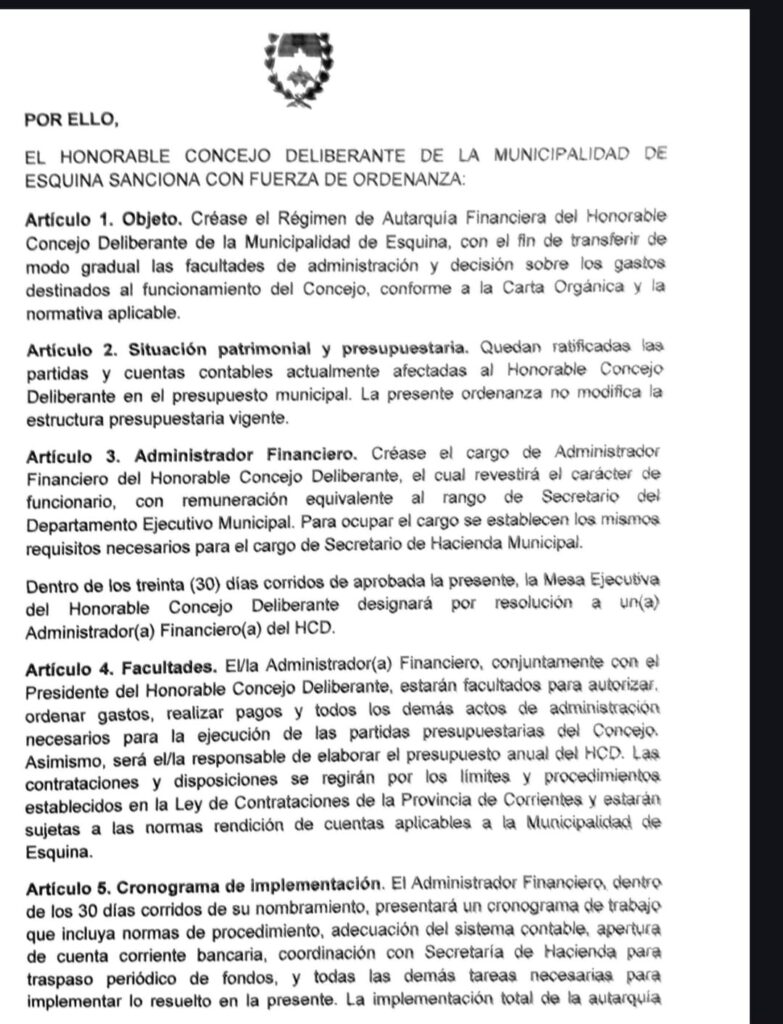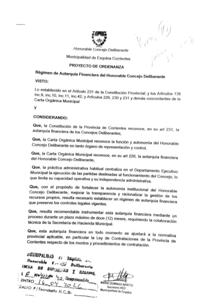 Un factor que respalda la viabilidad de este proyecto es que la Carta Orgánica de Esquina establece un porcentaje de fondos para el Concejo Deliberante que supera al de otros municipios de la provincia. Esto garantiza que la autarquía financiera pueda implementarse sin poner en riesgo la estabilidad económica del organismo.