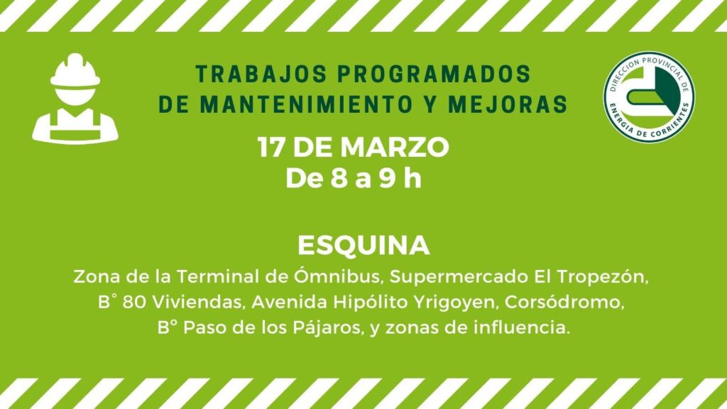 La Dirección Provincial de Energía de Corrientes (DPEC) informa que con motivo de realizar mejoras en el servicio, se ejecutarán tareas de tendido de nuevos cables preensamblados, por lo cual se interrumpirá el suministro de energía eléctrica en la localidad de ESQUINA, de acuerdo al siguiente cronograma: