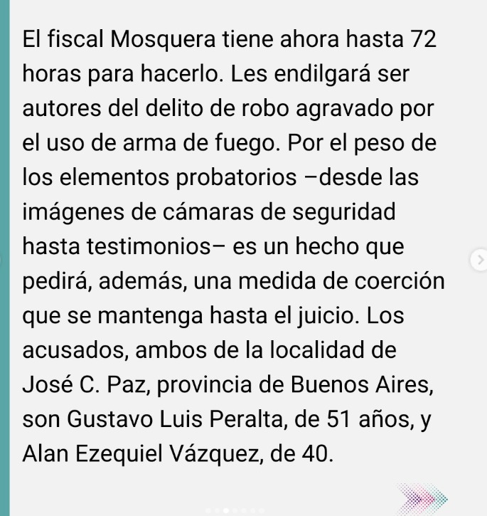 Los dos autores del millonario asalto fueron aprehendidos poco después de perpetrar el hecho y desde esta mañana permanecen detenidos, a la espera de la audiencia de imputación formal. Mosquera cuenta con un plazo de hasta 72 horas para acusarlos por el delito de robo agravado por el uso de arma de fuego y, debido al peso de las pruebas reunidas —entre ellas imágenes de cámaras de seguridad y testimonios— solicitará además una medida de coerción que se mantenga hasta el juicio.