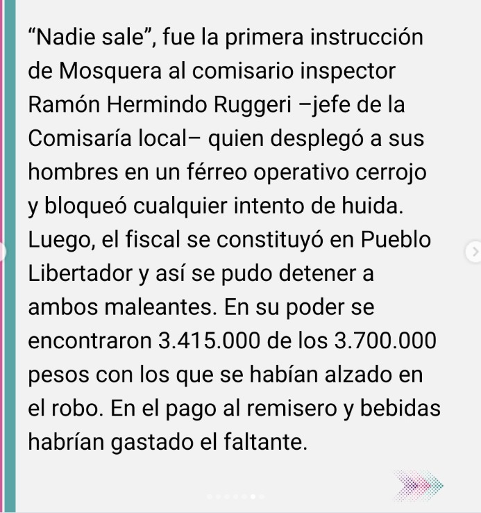 Tras el robo, los sospechosos huyeron hacia la localidad de Pueblo Libertador, donde el fiscal ordenó un operativo cerrojo. “Nadie sale”, fue la instrucción impartida por Mosquera al comisario inspector Ramón Hermindo Ruggeri, jefe de la comisaría local, quien desplegó un amplio dispositivo policial que bloqueó cualquier intento de fuga.