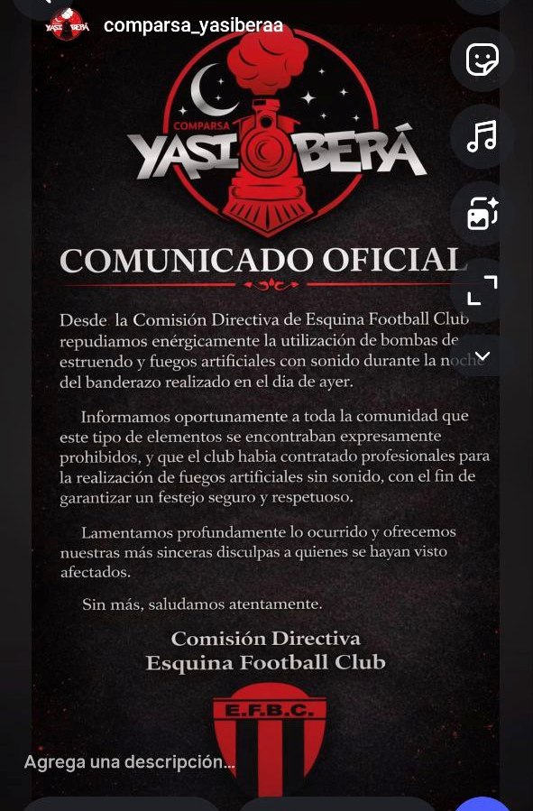 Desde la Comisión Directiva de Esquina Football Club repudiamos enérgicamente la utilización de bombas de estruendo y fuegos artificiales con sonido durante la noche del banderazo realizado en el día de ayer.