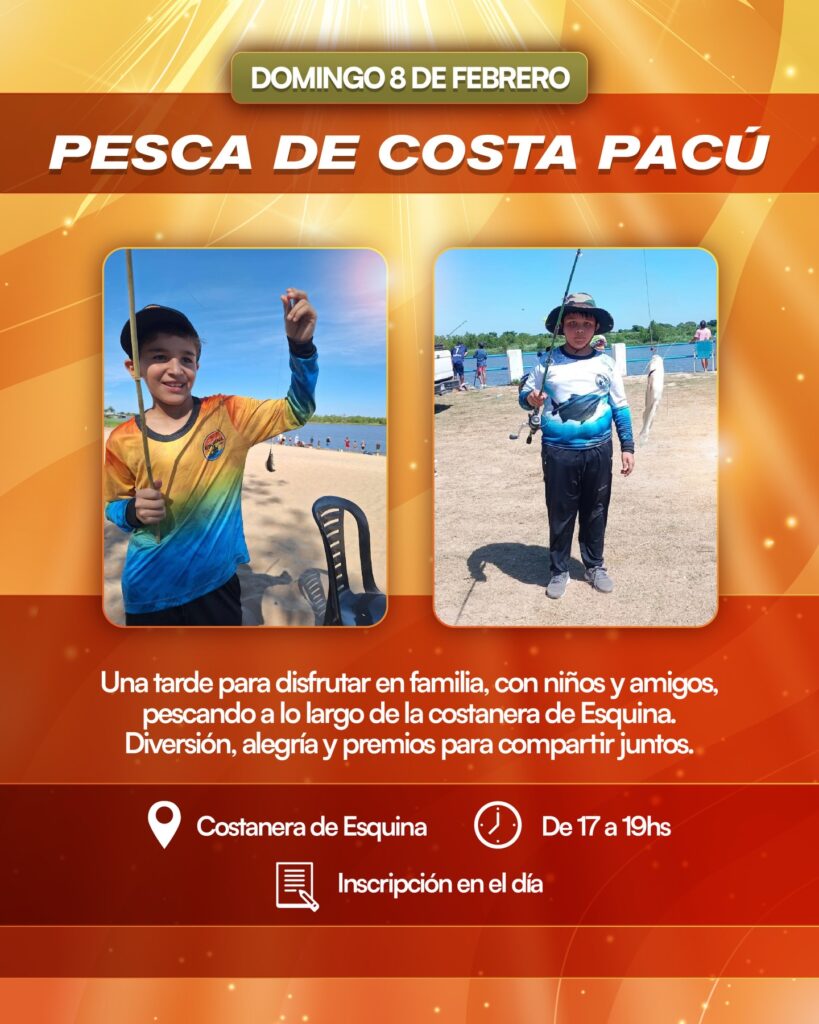 Bajo el lema #SemanaPacú, vecinos y visitantes podrán disfrutar de propuestas que resaltan la identidad local, el río y las tradiciones esquinenses. La programación incluye pesca de costa, torneo de truco, gran peña de pescadores, festival musical con elección de reina, el esperado torneo de pesca, y el cierre con cena show y entrega de premios.
