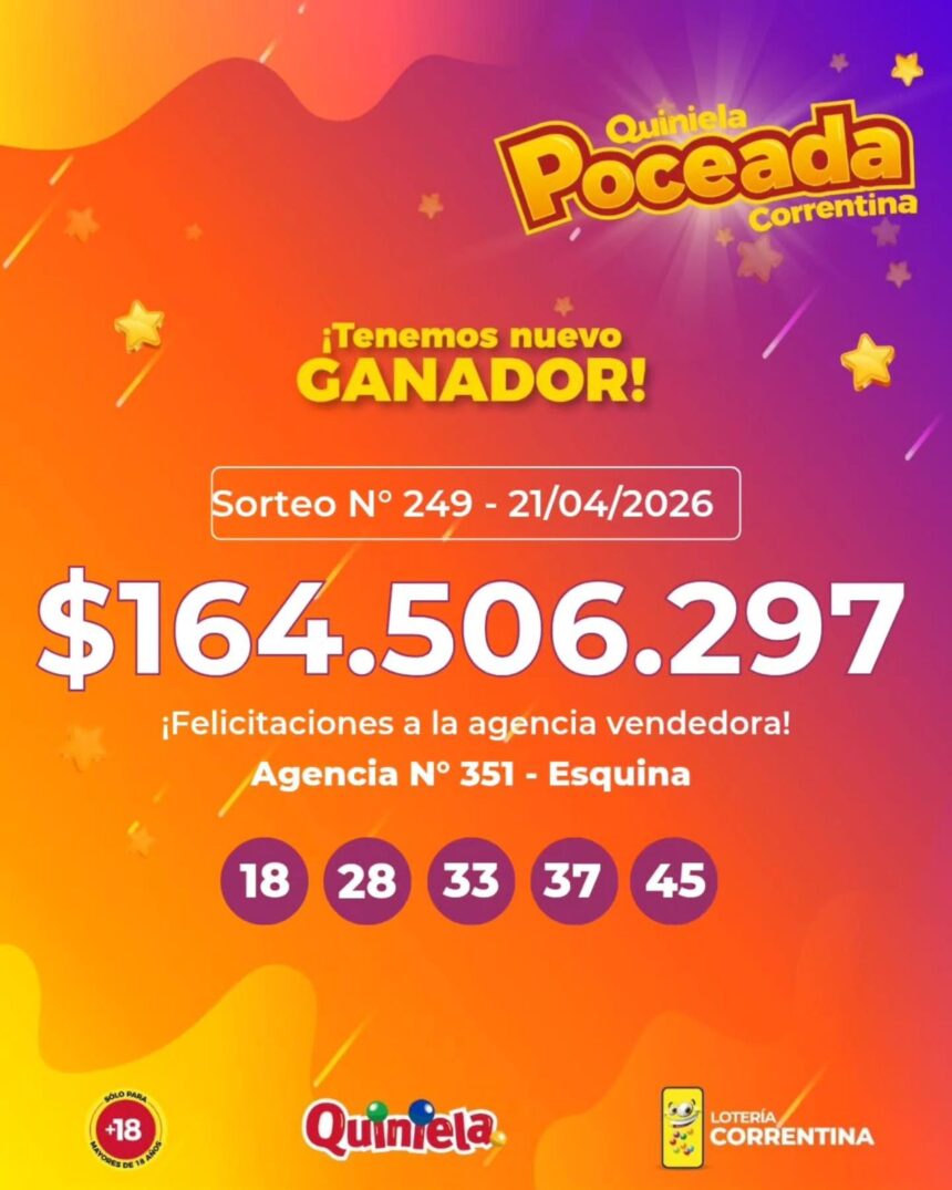 Un vecino de la ciudad de Esquina se convirtió en millonario tras resultar ganador del pozo mayor de la Quiniela Poceada Correntina, correspondiente al sorteo N° 249 realizado el martes 21 de abril de 2026.
