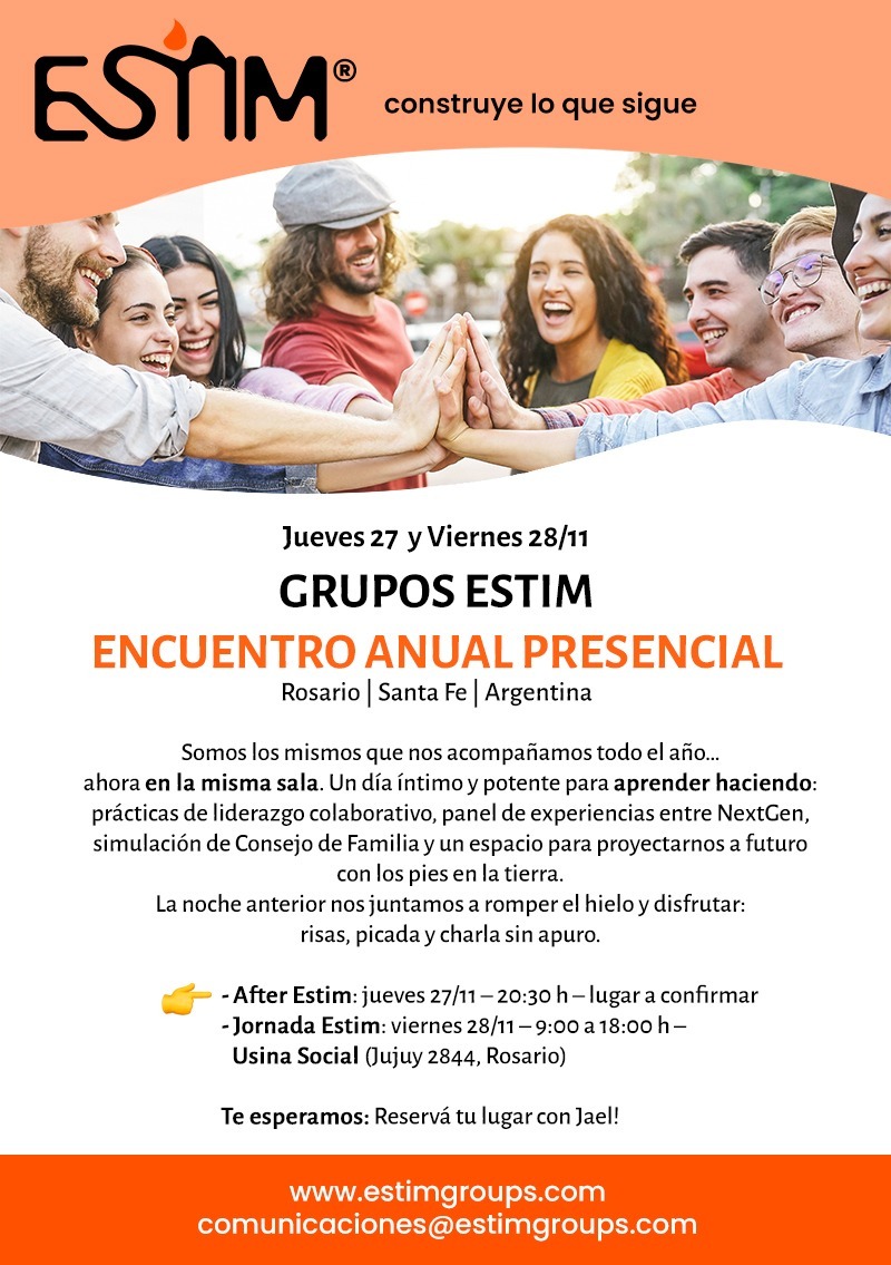 El jueves 27 y viernes 28 de noviembre ocurrirá en Rosario, Santa Fe, el primer encuentro anual presencial para los miembros de Grupos Estim de todo el país. Este evento marca un hito para Estim Groups, una organización que emerge como una herramienta clave en América Latina para fortalecer a las familias empresarias desde adentro. Estim Groups se especializa en ofrecer una metodología de desarrollo de grupos creada para ayudar a las nuevas generaciones a integrarse, encontrar su lugar y relacionarse de manera consciente con la empresa familiar y su legado.