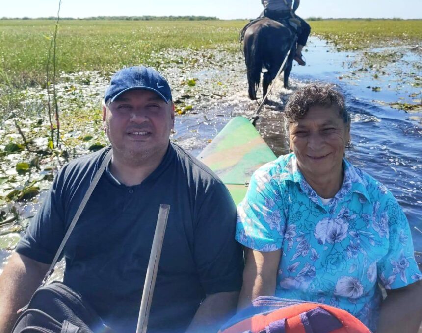 La travesía hacia la comunidad es compleja. Desde la entrada a Malvinas se requiere aproximadamente una hora en camioneta hasta el acceso al Malezal. A partir de allí comienza el recorrido más difícil: primero en canoa, luego a pie por senderos de maleza, barro y pantano, hasta llegar a otro brazo del arroyo Sarandí, un espacio de agua cubierto de camalotes y vegetación. Solo ese tramo demanda al menos dos horas.