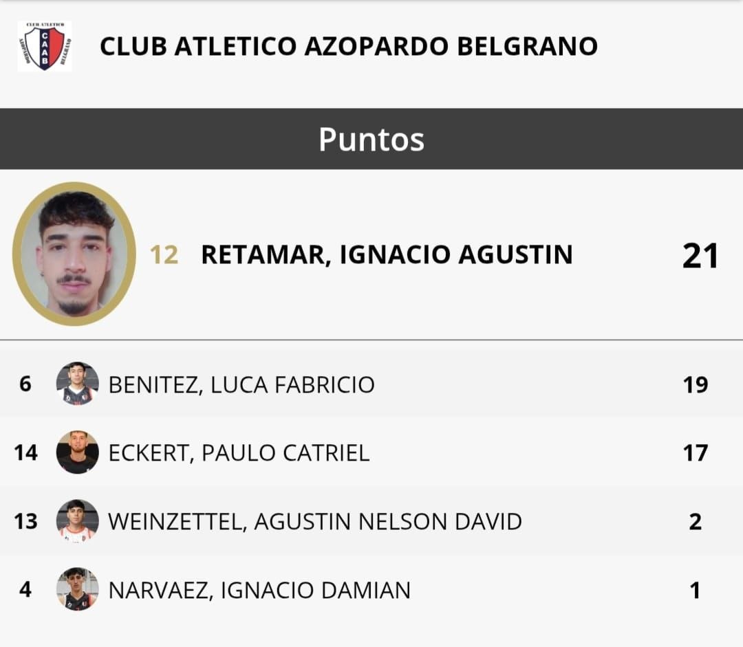 Por el lado de Azopardo Belgrano, el jugador más destacado fue Ignacio Agustín Retamar, quien finalizó con 21 puntos, seguido por Luca Fabricio Benítez (19) y Paulo Catriel Eckert (17), aunque sus aportes no fueron suficientes para revertir el dominio visitante.