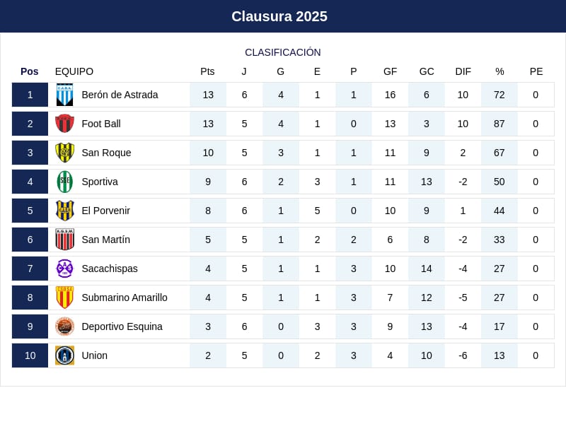 Con este resultado, Berón de Astrada alcanzó los 13 puntos y comparte el liderazgo del torneo junto a Foot Ball, que jugará este domingo frente a San Martín.