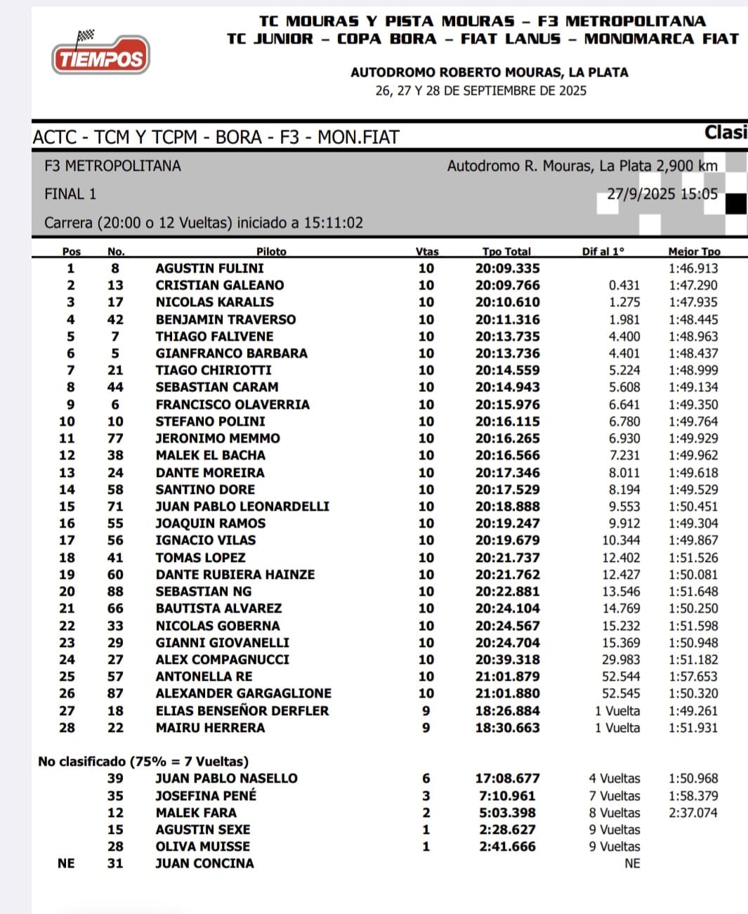 El comienzo tuvo varios golpes de escena: Bautista Álvarez y luego Malek Fara se despistaron en el curvón, lo que dejó a Nicolás Karalis al frente con una ventaja importante. Sin embargo, la neutralización en el 6º giro redujo las diferencias y en la última vuelta llegó la maniobra decisiva. Fulini se la jugó en el curvón, superó a Karalis y se encaminó al triunfo. Cristian Galeano aprovechó la situación y finalizó segundo, mientras que Karalis completó el podio en tercer lugar.