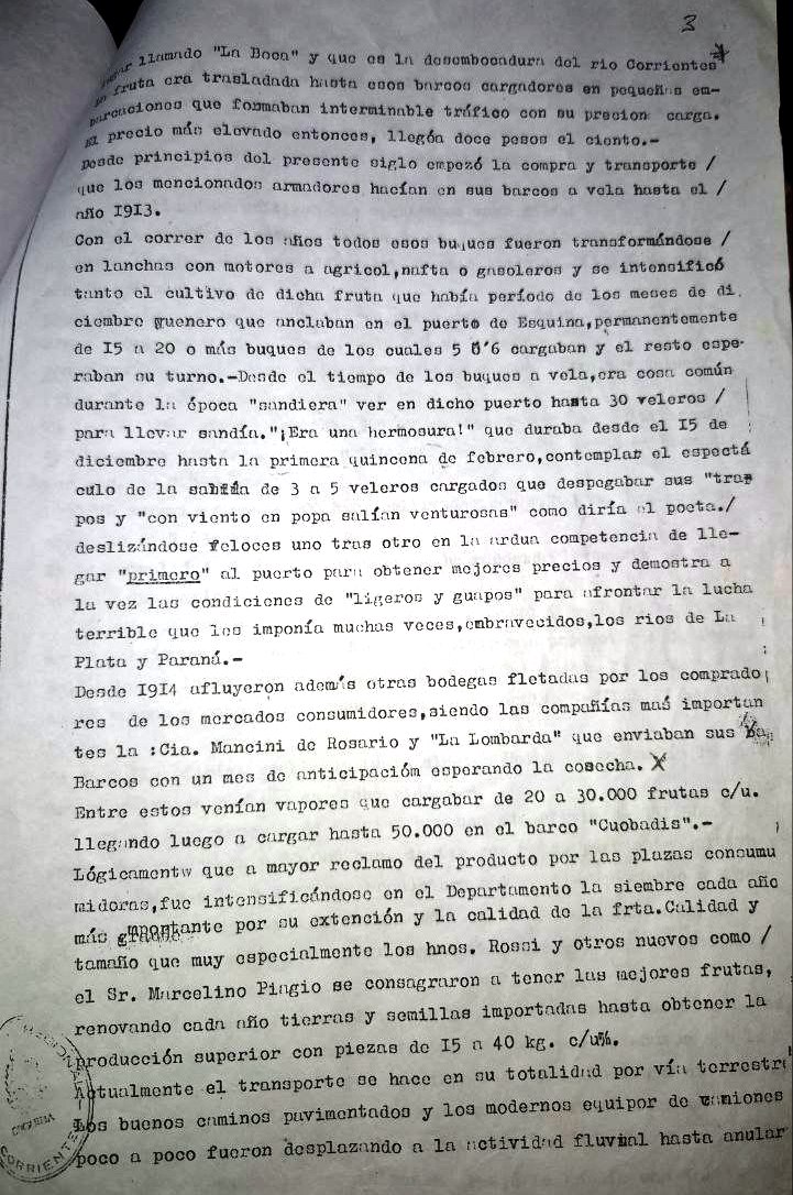 El traslado de la producción desde las chacras hasta los puertos de carga se realizaba mediante carretas y carros tirados por bueyes. Los principales puertos utilizados eran el de Esquina, el denominado “Ring” y el puerto “Loncín”, siempre que el nivel del río lo permitiera. En épocas de grandes bajantes, los barcos permanecían fondeados en el río Paraná.