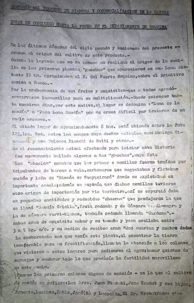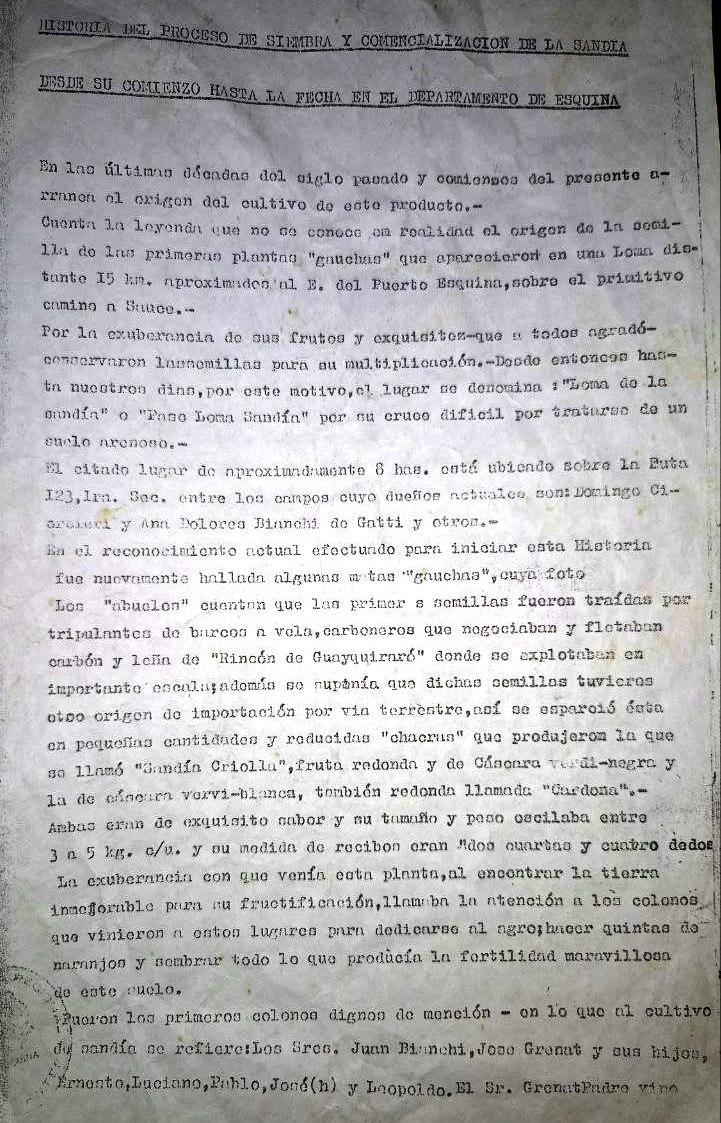 En las últimas décadas del siglo XIX y comienzos del siglo XX se origina el cultivo de la sandía en el Departamento de Esquina, actividad que con el correr de los años se convertiría en uno de los rasgos productivos y culturales más representativos de la región.