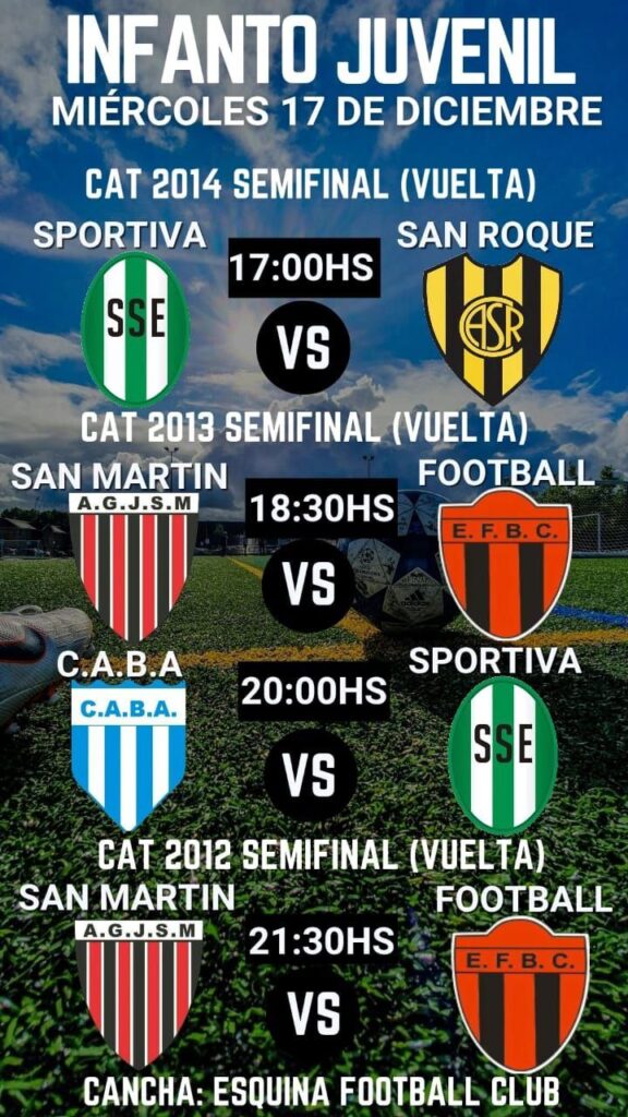 ste miércoles 17 de diciembre se disputará una intensa jornada de Infanto Juvenil, con los partidos de semifinal (vuelta) en distintas categorías. La acción tendrá lugar en la cancha de Esquina Foot Ball Club, donde se definirán los finalistas del certamen.