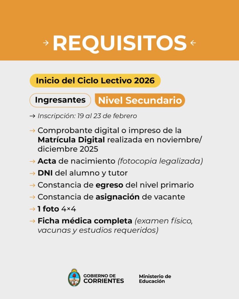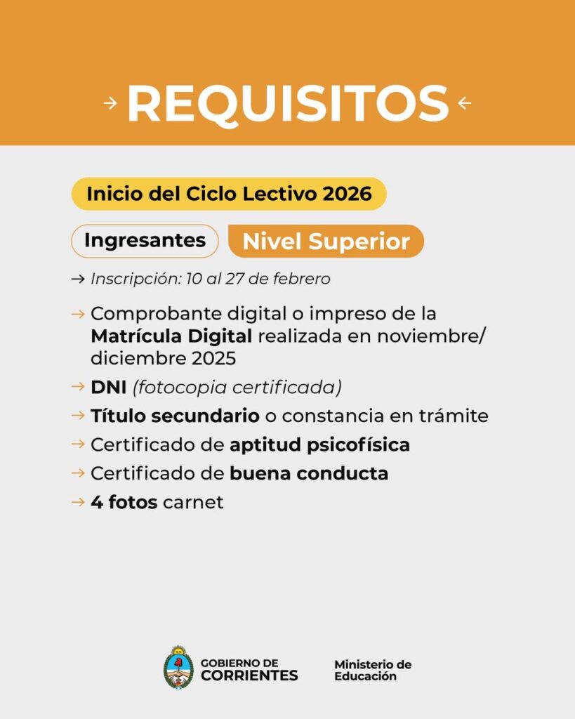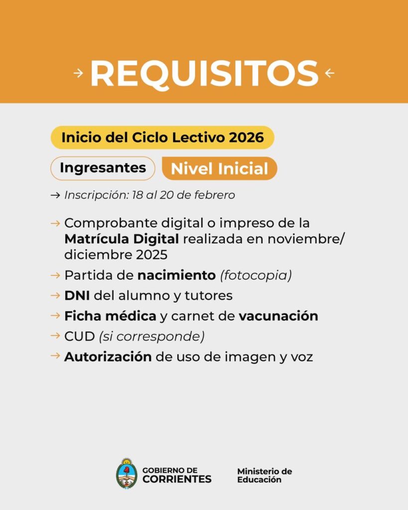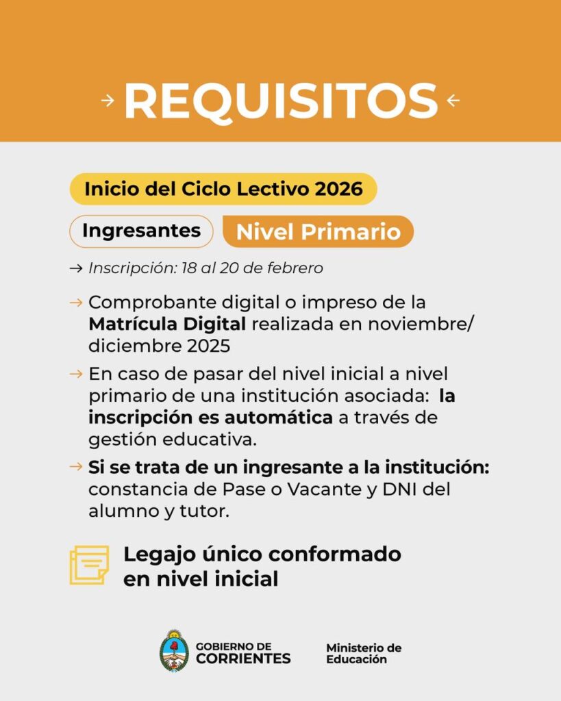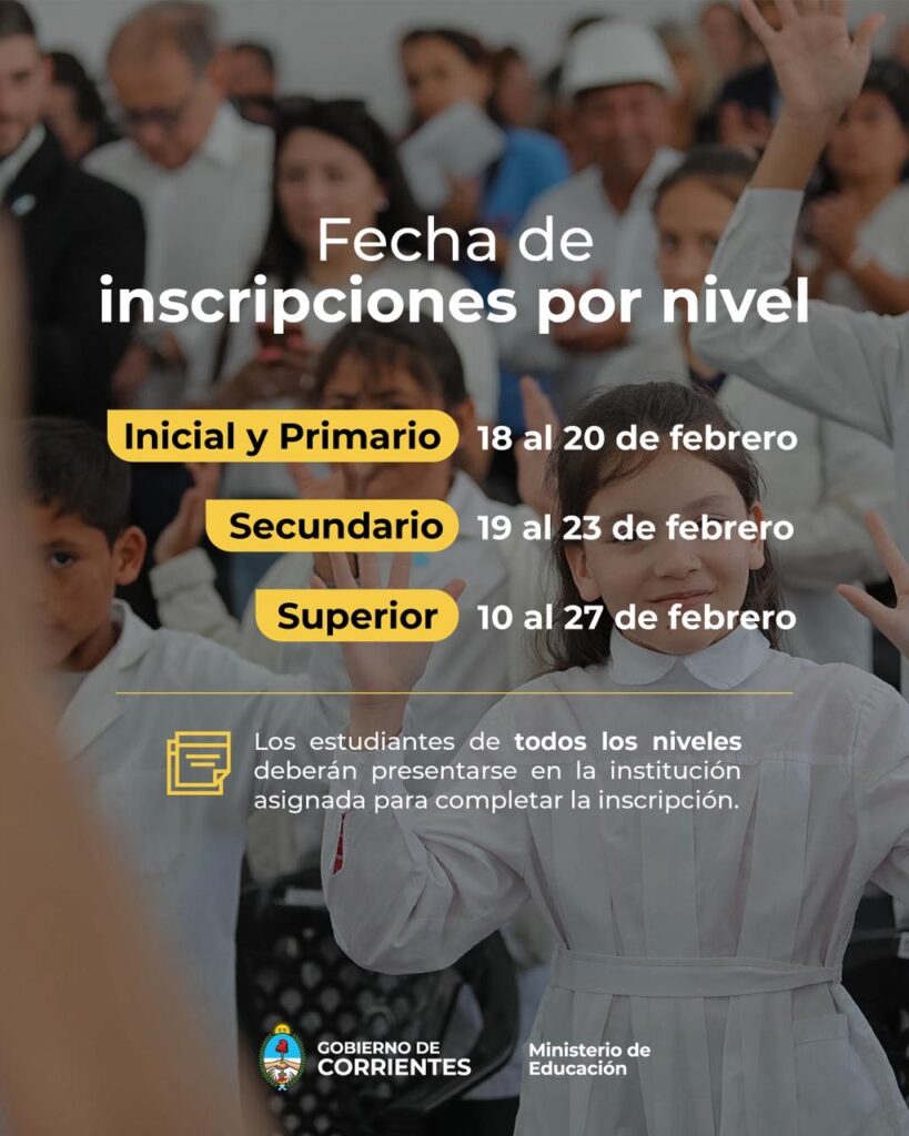 El Gobierno de Corrientes, a través del Ministerio de Educación, informa que los alumnos de todos los niveles deberán presentarse en las instituciones a las que fueron asignados, para completar allí el proceso de inscripción. En los niveles inicial y primario este trámite deberá realizarse del 18 al 20 de febrero. Para el secundario la fecha asignada es del 19 al 23 de febrero, y para el nivel superior la fecha es del 10 al 27 de febrero.