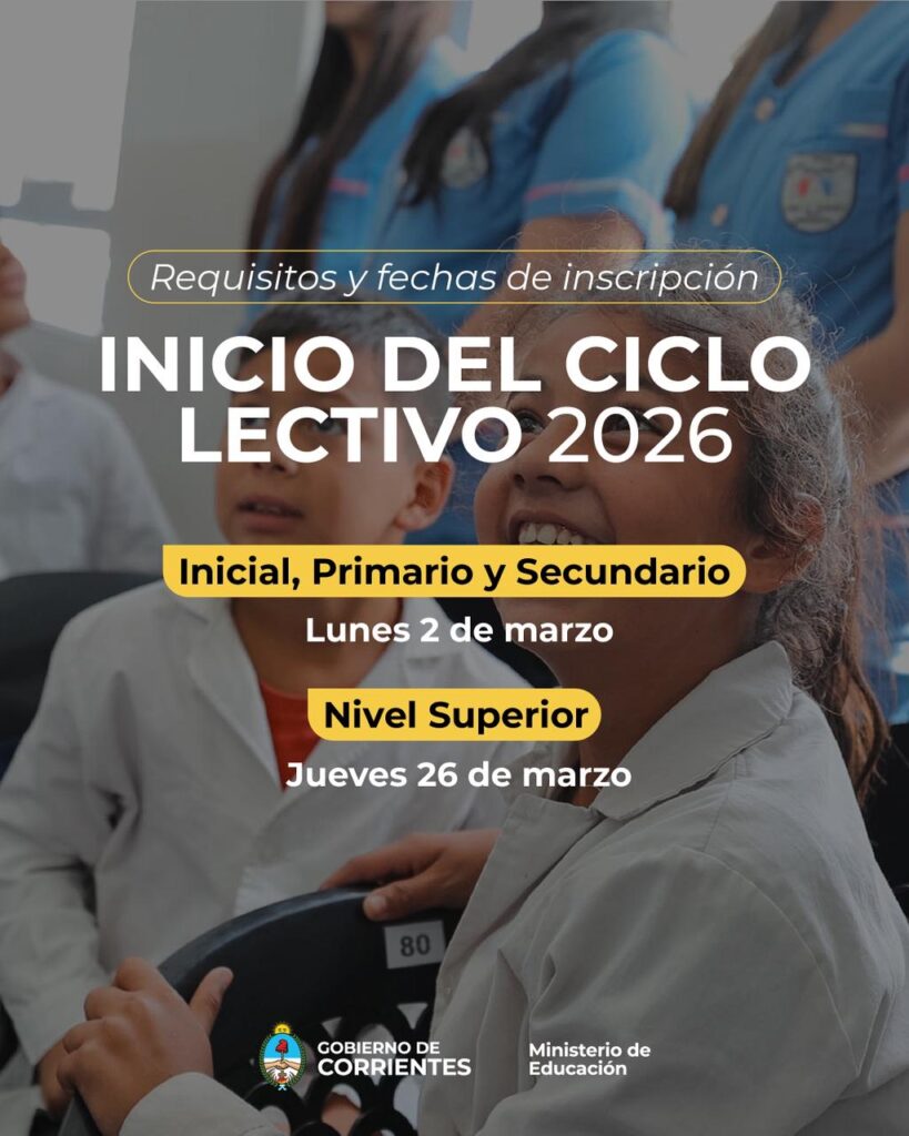 El calendario escolar 2026 indica que en Corrientes el inicio oficial del ciclo lectivo para los niveles inicial, primario y secundario será el lunes 02 de marzo, mientras que para superior el comienzo de clases está previsto para el 26 de marzo. Con el objetivo de completar legajos, los estudiantes deberán presentarse en sus establecimientos con la documentación requerida para cada nivel.