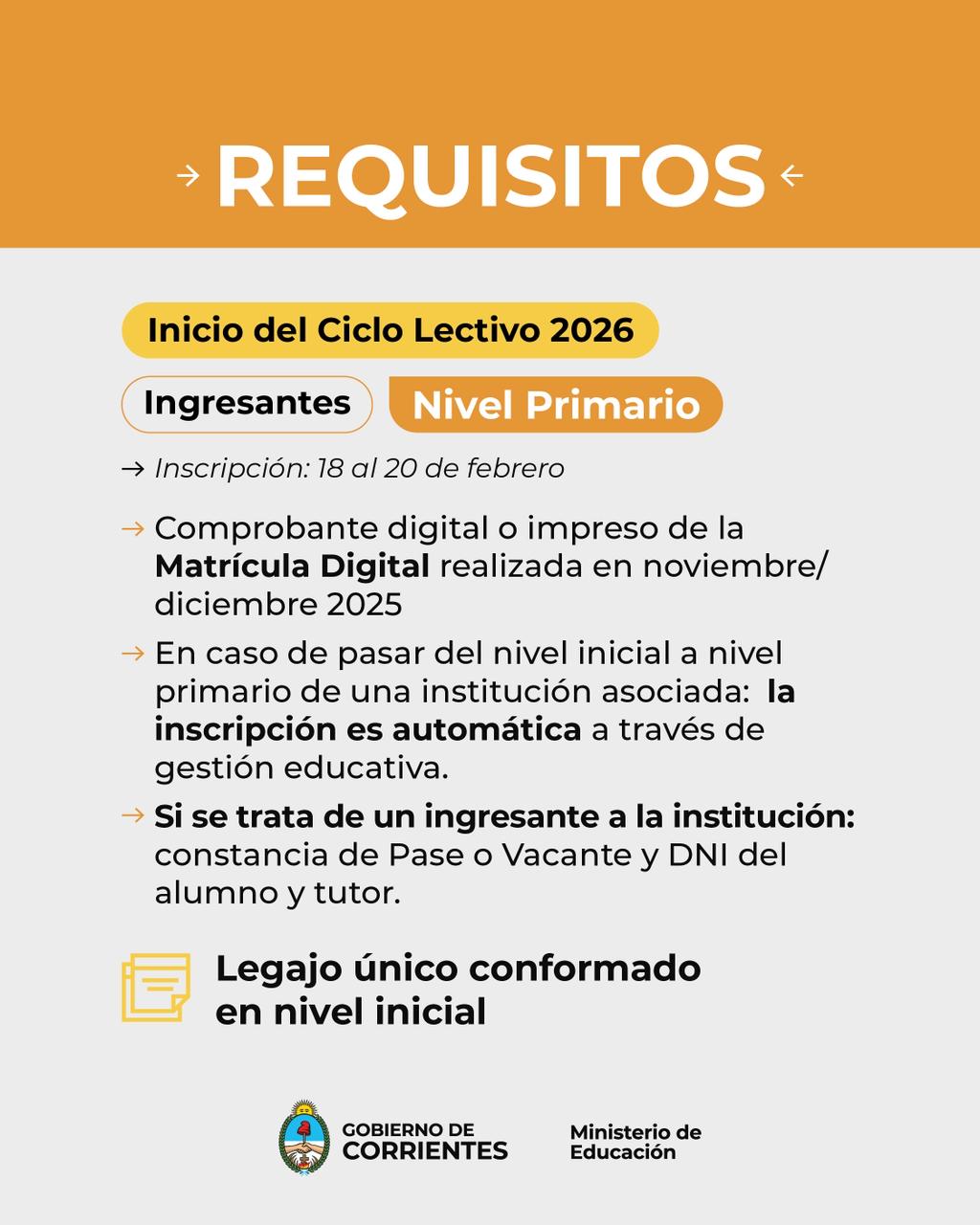 El Gobierno de Corrientes, a través del Ministerio de Educación, informa que los alumnos de todos los niveles deberán presentarse en las instituciones a las que fueron asignados, para completar allí el proceso de inscripción. En los niveles inicial y primario este trámite deberá realizarse del 18 al 20 de febrero. Para el secundario la fecha asignada es del 19 al 23 de febrero, y para el nivel superior la fecha es del 10 al 27 de febrero.