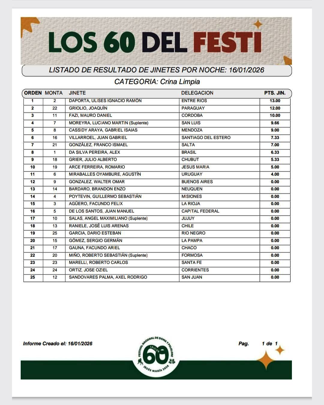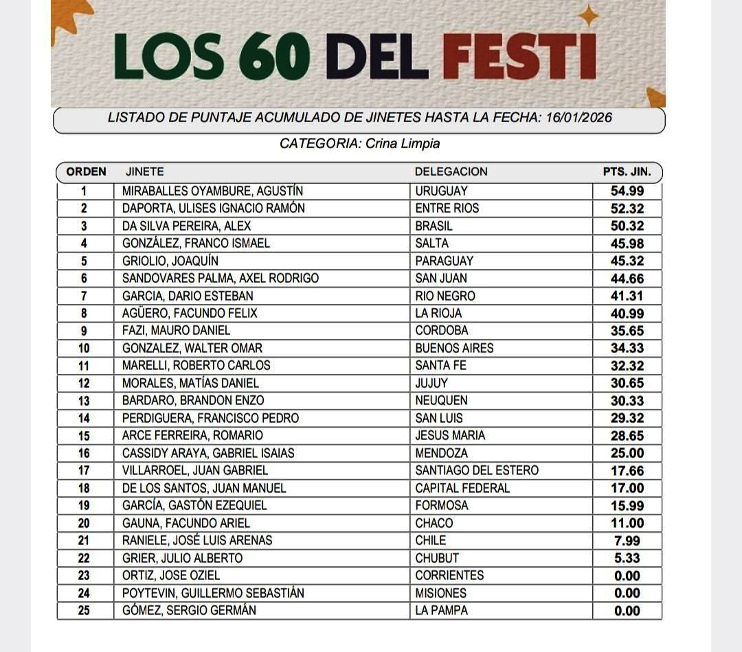 Durante la jornada del viernes 16 de enero, el esquinense tuvo una brillante actuación, finalizando segundo en la noche y sumando 12 puntos, según el listado oficial de resultados diarios.