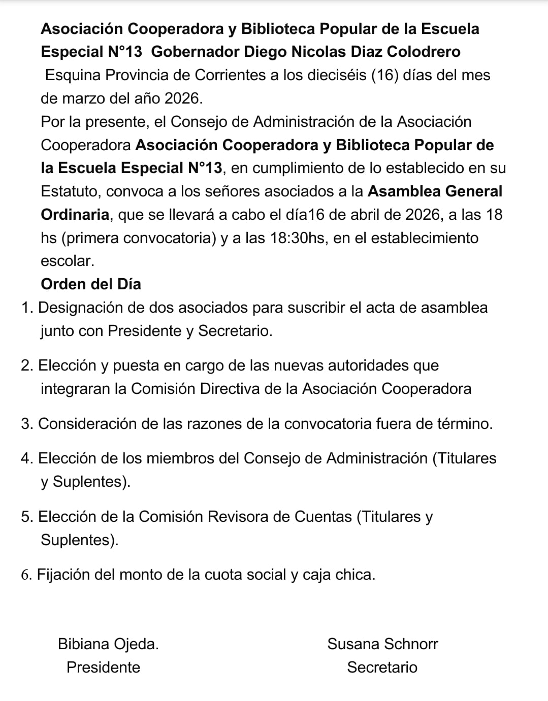 La Asociación Cooperadora y Biblioteca Popular de la Escuela Especial N°13 “Gobernador Diego Nicolás Díaz Colodrero” anunció la realización de su Asamblea General Ordinaria, que tendrá lugar el próximo 16 de abril de 2026 en el establecimiento escolar.