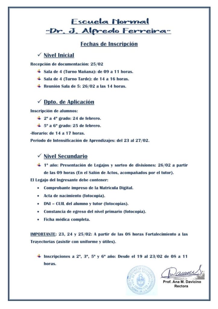 - Del 19 al 23 de febrero se realizaron las inscripciones para 2°, 3°, 5° y 6° año, en el horario de 8 a 11 horas.