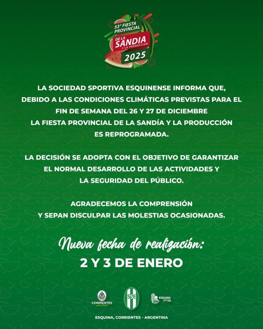 Desde la Sociedad Sportiva Esquinense se informó que, debido a las condiciones climáticas previstas para los días 26 y 27 de diciembre, la Fiesta Provincial de la Sandía y la Producción será reprogramada con el objetivo de resguardar al público y garantizar el correcto desarrollo del evento.