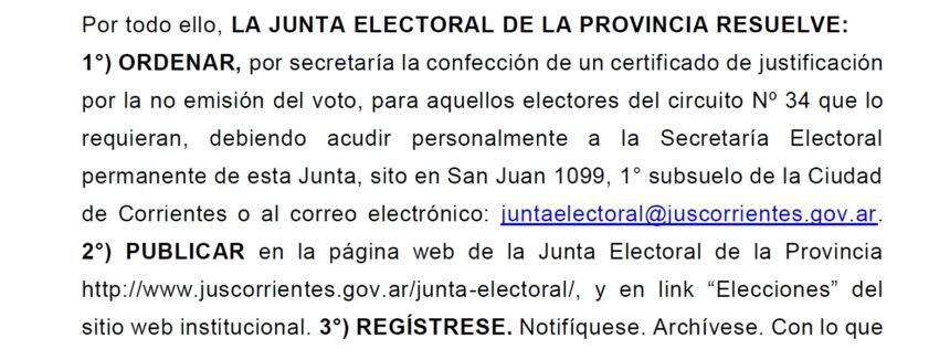 ACTA N° 58 : “LA JUNTA ELECTORAL DE LA PROVINCIA RESUELVE: 1°) ORDENAR, por secretaría la confección de un certificado de justificación por la no emisión del voto, para aquellos electores del circuito Nº 34 que lo requieran, debiendo acudir personalmente a la Secretaría Electoral permanente de esta Junta, sito en San Juan 1099, 1° subsuelo de la Ciudad de Corrientes o al correo electrónico: juntaelectoral@juscorrientes.gov.ar. 2°) PUBLICAR en la página web de la Junta Electoral de la Provincia http://www.juscorrientes.gov.ar/junta-electoral/, y en link “Elecciones” del sitio web institucional. 3°) REGÍSTRESE…”