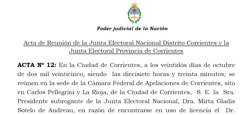 En el día de ayer, 22 de octubre, se reunieron en la sede de la Cámara Federal de Apelaciones de Corrientes, S. E. la Sra. Presidente subrogante de la Junta Electoral Nacional, Dra. Mirta Gladis Sotelo de Andreau, el Vocal, Dr. Gustavo del C. de J. Fresneda, el Vocal Dr. Luis Eduardo Rey Vázquez, asistidos por el Sr. Secretario Electoral Nacional, Dr. Juan José Ferreyra, junto con el Presidente de la H. Junta Electoral Provincial de Corrientes, el Dr. Gustavo Sebastián Sánchez Mariño, la Vocal Dra. María Eugenia Herrero, la Vocal Dra. María Beatriz Benítez, asistidos por el Secretario Electoral de la Provincia, Dr. Esteban Matías Bella y por el Prosecretario Dr. Facundo José San Lorenzo.