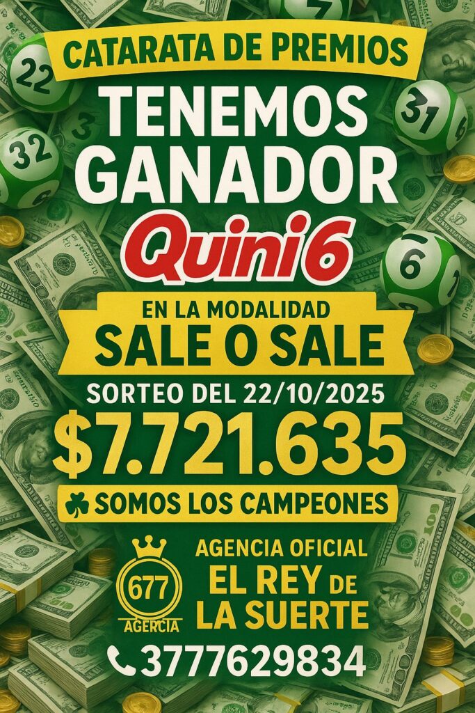 La suerte volvió a sonreírle a la ciudad de Esquina. En el sorteo del Quini 6 realizado el 22 de octubre de 2025, un apostador de la agencia “El Rey de la Suerte”, N° 677, resultó ganador en la modalidad “Sale o Sale”, llevándose un premio de $7.721.635.