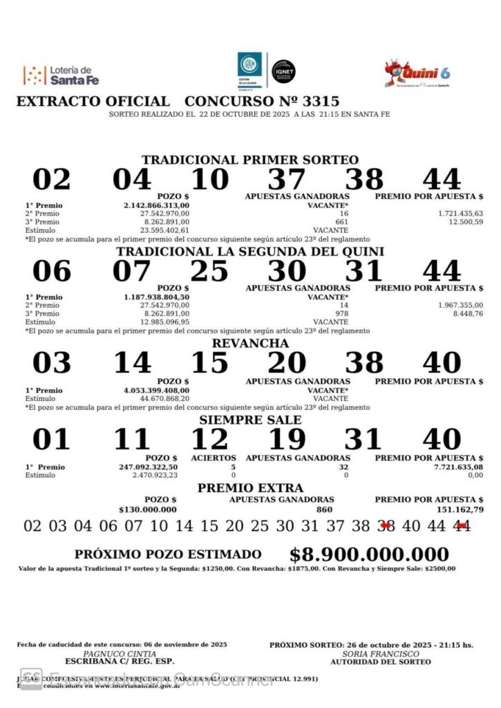 El sorteo N° 3315 del Quini 6 tuvo como números favorecidos el 01, 11, 12, 19, 31 y 40, y contó con 32 ganadores en todo el país, quienes acertaron cinco números y recibirán $7.721.635 cada uno.