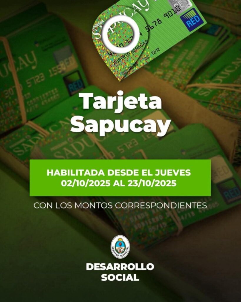 El Ministerio de Desarrollo Social de la provincia de Corrientes informó que la tarjeta Sapucay quedará habilitada con los montos correspondientes a partir del jueves 2 de octubre, y los beneficiarios tendrán tiempo de utilizarla hasta el miércoles 23 de octubre de 2025.
